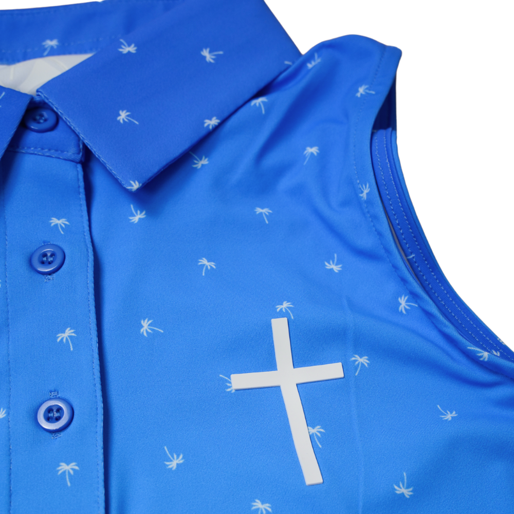 Stay cool and stylish on the course with our Gospel Golf Women's Sleeveless Polo, featuring a charming palm tree pattern. Perfect for hot weather, this polo is designed to provide maximum breathability and comfort, keeping you fresh and focused during your game. Made from the highest quality materials, it offers superior moisture-wicking and flexibility, allowing for unrestricted movement and ultimate performance. With its sleeveless design and playful print, this polo combines fashion and function, making it a must-have for any female golfer. Embrace the sun and your game with our Gospel Golf Women's Sleeveless Polo, and let your faith and style shine